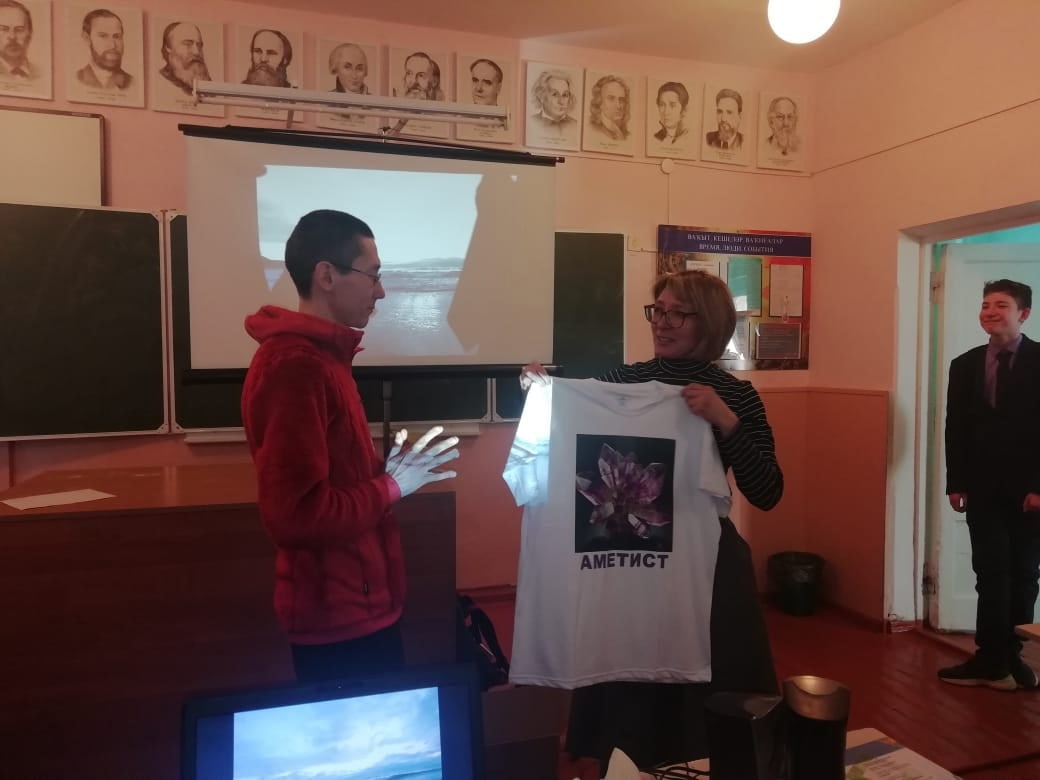 Он к нам пришёл не с пустыми руками - подарил целую коробку с окаменелостями и интересными минералами. А мы же в ответ подарили футболку с нашим логотипом "Аметист".